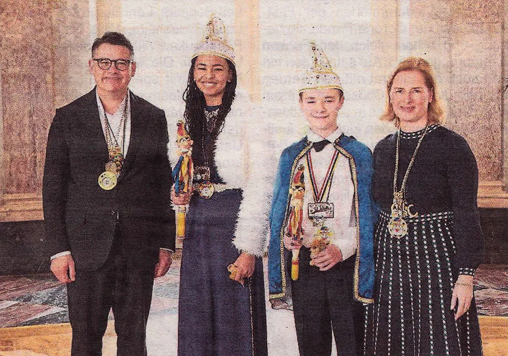 Majestäten im Schloss: Ministerpräsident Boris Rhein hat hessische Fastnachtsvereine eingeladen. Insgesamt 425 Repräsentanten des närrischen Brauchtums waren ins Schloss Biebrich nach Wiesbaden eingeladen. Zu den Gästen gehörten auch das Kinderprinzenpaar Prinzessin Victoria I. und Prinz Joshua I. vom Carneval-Verein „Narrhalla" Winkel/ Rheingau e. V. 1924. Das Foto zeigt Ministerpräsident Boris Rhein und seine Frau Tanja Raab-Rhein mit dem Kinderprinzenpaar Prinzessin Victoria I. (Steinmetz) und Prinz Joshua I. (Lappas) vom Carneval-Verein ,,Narrhalla" Winkel/Rheingau e. V. 1924.