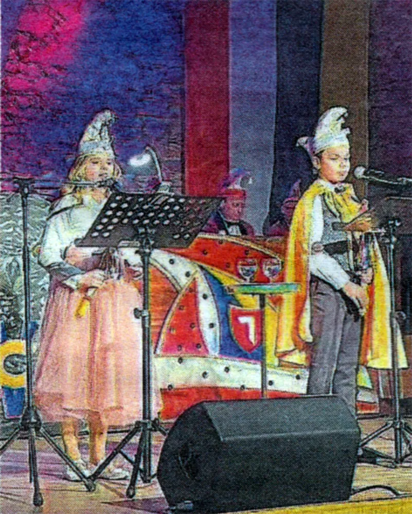 Seit 2020 hat Patrick Halbritter den Bajazz des Sitzungspräsidenten übernommen und auch in diesem Jahr führte er überaus pfiffig und gutgelaunt durch den Abend und die Nacht. Natürlich hatte er es auch nicht schwer, sein Publikum zu begeistern, standen doch fast 100 Aktive, davon die Hälfte unter 25 Jahren, mit ihm bereit, die Gäste närrisch zu unterhalten. Wie das 34. Kinderprinzenpaar: Königliche Grüße richtete das diesjährige CVW-Kinderprinzenpaar an seine närrischen Untertanen. Ganz cool stellten sich Lio Thomas und Julie Lappas dem Publikum vor und forderten gleich mehrfach ein Helau von ihrem närrischen Volk. Seine Tollität Prinz Lio ist „Großer Meister des Zu- und Abspiels, von Eck- und sonstigen Bällen, vertraut mit der Narrenzahl ,,elf“. Tonsicherer Herrscher gesanglicher Rhythmen in zweiter Generation zur Narrhalla Wincolorum“. Ihre Lieblichkeit Prinzessin Julie trägt den Titel ,,Exzellente Expertin vieler Rollen, vorwärts und rückwärts. Närrin des Pferdes als Turngerät und Reittier. Stimmführende Beherrscherin aller närrischen Töne und Takte in Vinicella“.